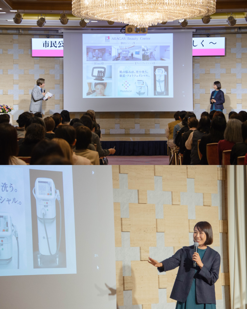 当日は、ファッションプロデューサー植松晃士さんと現代日本画家大竹寛子さんによるトークショー、形成外科 柳瀬桜子医師から「ARAGAS Beauty Center」をご紹介させていただきました。