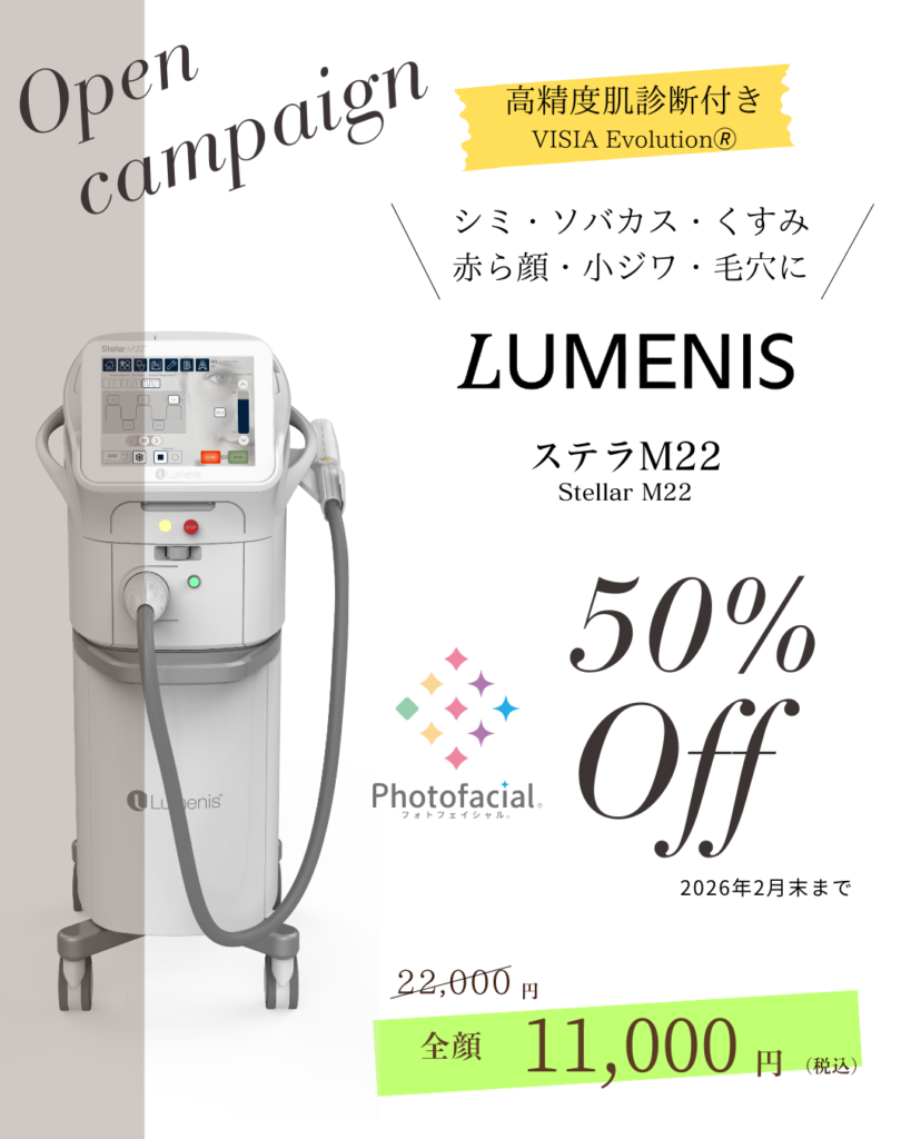 オープニングキャンペーンとして、フォトフェイシャルステラM22を初めて受けられる方限定で50%OFFにてご提供します。